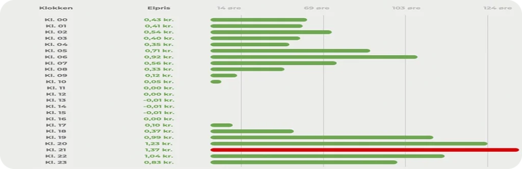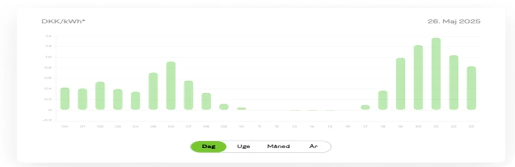 Hos NRGi kan du følge elpriserne time for time og tilpasse dit forbrug til de billigste timer – fx var prisen den 26. maj 2025 helt nede på -0,01 kr./kWh kl. 13 og oppe på 1,37 kr./kWh kl. 21. Gennemsnitsprisen for dagen lå på 0,45 kr./kWh.