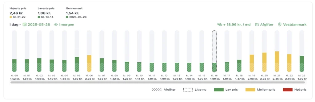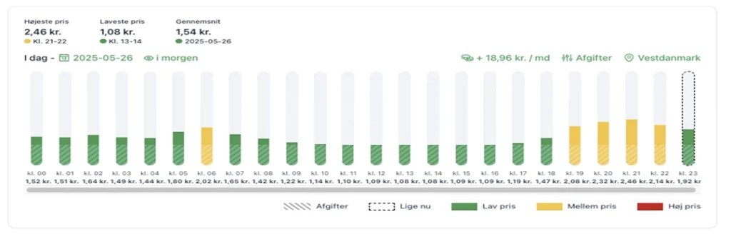 Du kan nemt vælge område (Øst/Vest), følge priserne via prisgraf og få mest muligt ud af dine kWh – både økonomisk og klimamæssigt.
